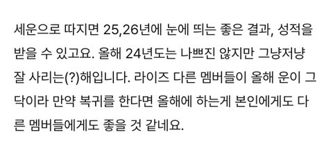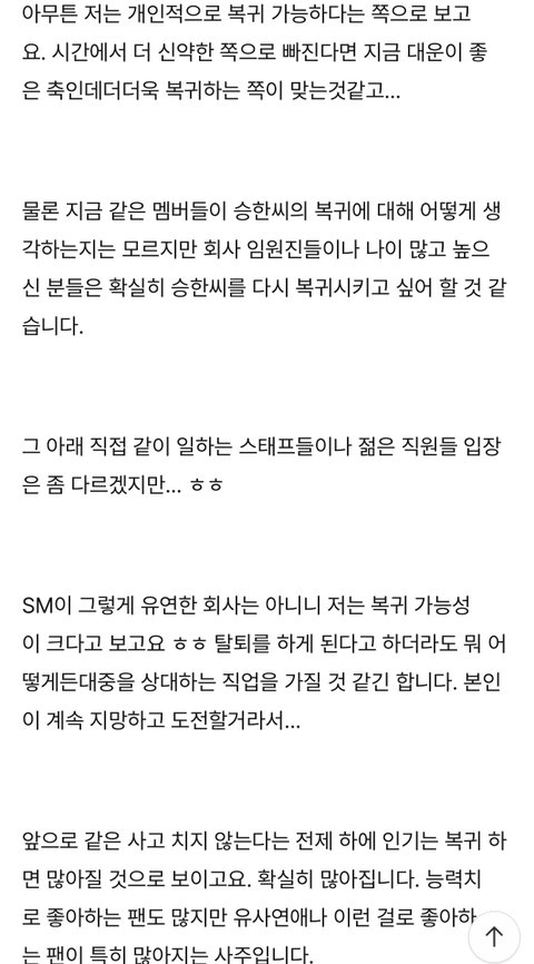 사주 볼 줄 아는데 저 내용이 맞긴 맞음. 일단 승한 사주가 윗 사람 덕을 볼 수 있는 사주╋동시에 아랫사람 덕은 보기 힘들어서 임원진들은 복귀를 찬성하고 아랫사람들생각은 다를거라는 풀이가 나온 듯. 근데 의외로 동료복은 괜찮은 사주임.(다만 작년엔 인간관계에 있어 문제가 생기는 시기라 라방이랑 카톡이 폭로된거) 물론 본인이 잘 한다는 전제하에 ㅇㅇ. 본인이 잘 하면 본인을 도와주는 사람이 있는 사주인데 문제는 본능적으로 행동하는 면이 너무 강한 타입이고 생각보다 행동이 앞섬. 직설적이게 말하면 생각 자체를 안하고 행동하는 면이 강함. 이런 부분을 인지하고 고치면 동료복 자체는 좋은 사주임 친구 말 잘 들어야 하는 사주인데 문제는 잘 안 들을거라 무조건 잘 듣는 방향으로 가야함. 그리고 복귀를 하면 인기가 많아질거라고 한 이유도 사주 상으로만 보면 맞긴 함. 내년부터 운기가 엄청나게 좋아져서 복귀만 한다면 내년부터 운기는 탁 트일 듯. 라이즈 팬 아님 그냥 사주 배운 사람이라 지나가다가 말 얹어봄