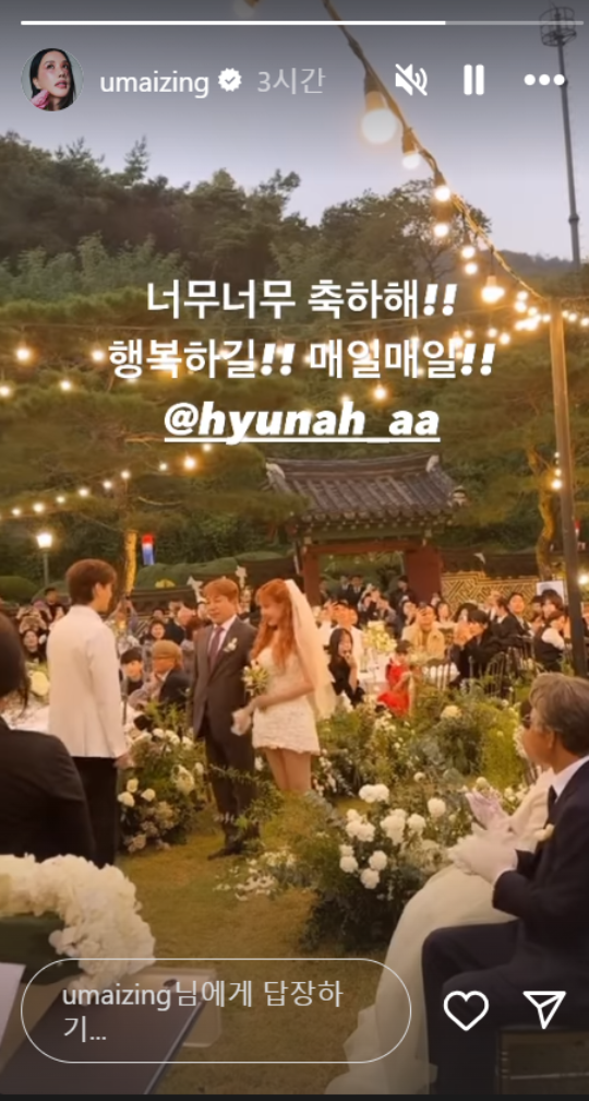 엄정화는 11일 자신의 SNS에 현아와 용준형의 결혼식 장면을 찍은 사진을 게재했다.