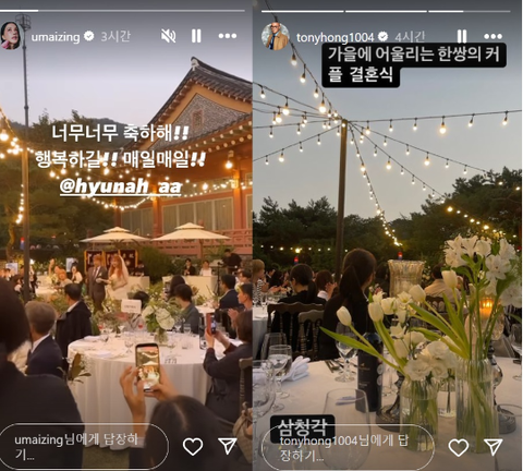 가수 엄정화와 방송인 홍석천이 용준형, 현아 결혼식을 인증했다.사진=엄정화, 홍석천 SNS