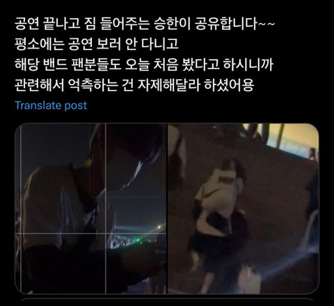 사실 이건 해명하는 것도 웃기지만 목격담 사진에 같이 나온 친구 분 밴드 공연이 한강에서 열려서 보러 간거임. 당시 지금까지 공연이나 보러다닌거냐고 욕먹으니까 해당 밴드 팬분들이 자기들도 지금까지 홍승한 공연에서 본거 처음이라고 함.