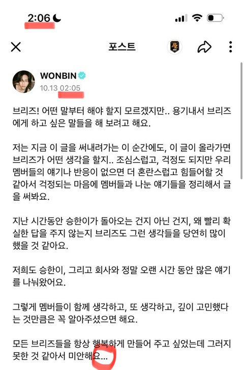 8. 어제 새벽에 멤버가 올린 위버스 글