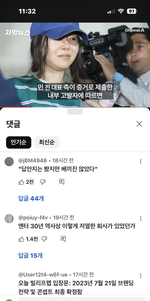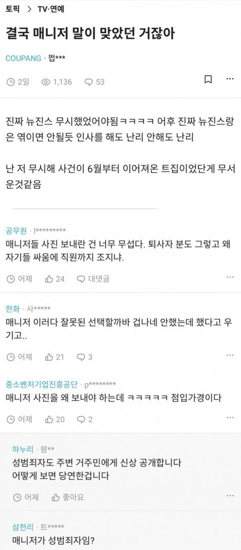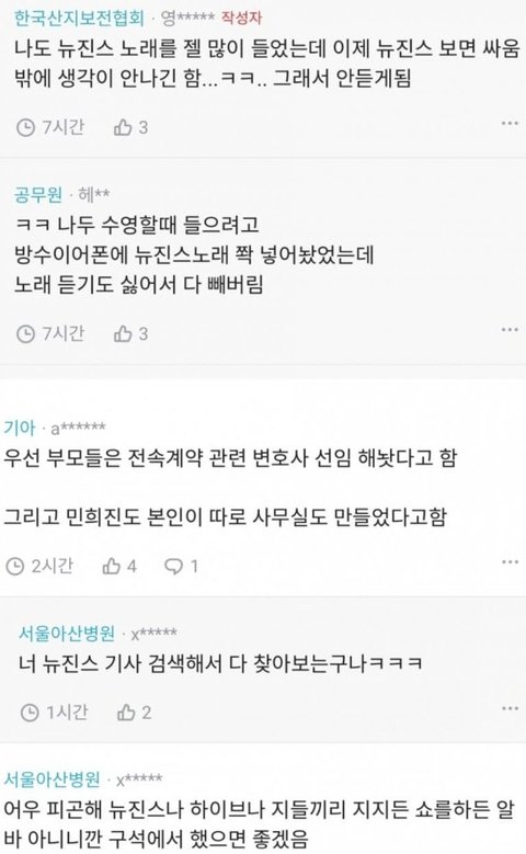 해린 혜인 목격담 뜨자마자 뉴진스팬들 + 민희진팬들 모여있는 갤러리에서 두명 욕하는중인데 이중성 ㅈㄴ웃김 (갤이름은 가림) 다니엘 민...