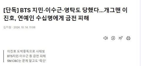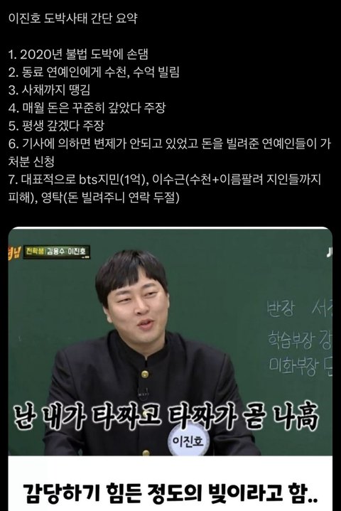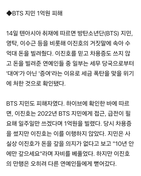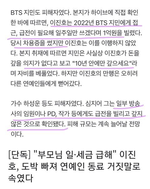 지민 지인 이용해서 22년에 지민한테 의도 가지고 접근해서 일주일만에 값는다했다는데 차용증까지 쓰고 법적으로 처리한거면 걍 엄청 친한 사이도 아닌거 같은데 짧은 기간 대충 친분 쌓고 심지어 돈빌린 이유도 부모 팔아서 급전 타령하는데 어케 안빌려주겠냐? 거기다 방송 피디 작가들한테도 손 벌린 거 보면 급한대로 막 돈 빌리고 다닌 거 맞아 보여 그나마 지민은 차용증이라도 썼지 그거 안 쓴 피해자들은 그대로 세금 폭탄 맞을각임ㅇ 그리고 실제 이진호랑 절친으로 알려진 개그맨들은 저 피해자 명단에 없던데 그것만봐도 더이상 빌릴데 없으니깐 거짓말까지 치면서 저런거야 ㅁㅊ