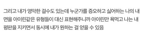 그리고 내가 영악한 걸수도 있는데 누군가를 증오하고 싫어하는 나의 내면을 아이린같은 유형들이 대신 표현해주니까 아이린만 욕먹고 나는 내 평판을 지키면서 동시에 내가 원하는 걸 얻을 수 있음