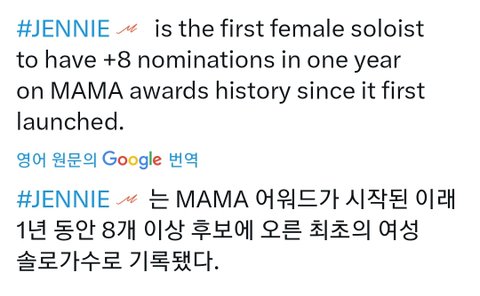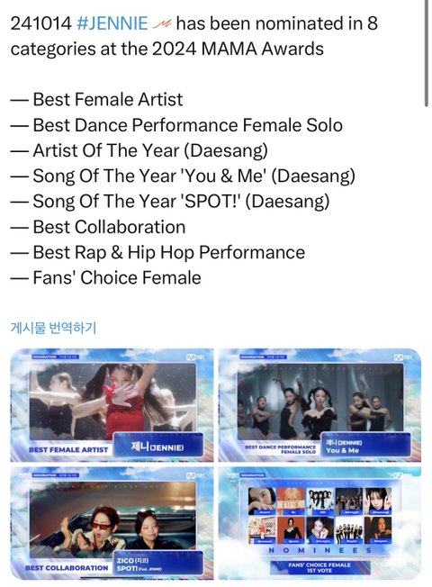 제니 2024 마마 8개 부문 노미됐는데 여자 솔로 최다임
