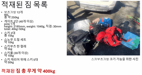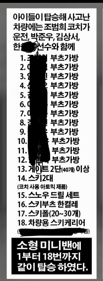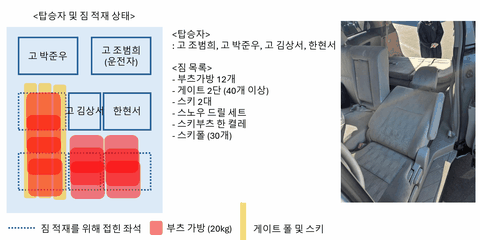 저희가 스키장비 짐에 민감한 이유는 따로 있습니다. 아이들과 짐을 함께 적재한 것은 이번이 처음이 아니기 때문입니다. 감독이 평소에도 위험하게 짐과 아이들을 같이 실어서 (승합차에 아이들을 태우고 그 가운데 아이들 키높이로 날카로운 스키를 배치하는 등) 아이들 부상도 있었습니다. 수차례 개선을 약속하였으나 지켜지지 않아서 결국 국내 시즌 때는 상서 아버지가 직접 사용하던 1톤 트럭을 기부하였습니다. 저희도 준우의 안전이 걱정되어 국내 전지훈련이 있으면 준우를 스키장까지 매번 태워주고 했습니다. 매년 스키시즌 때마다 아이들과 짐은 분리해달라고 당부하였고, 이번에도 누누이 당부했으나 감독은 비용 절감을 위해 짐차에 아이들을 태웠습니다. 뉴질랜드 법에는 적재량을 초과하는 짐을 싣는 것에 대해 불법으로 규정하고 있습니다. 약 400kg의 스키 관련 훈련 장비들을 실었다면 이는 과적입니다. 그러나 감독은 한 차에 짐과 아이들을 모두 적재한 것을 보고도 무관심하였고, 400kg의 짐이 있다는 걸 보고도 책임자로서 아이들의 탑승을 제지하지 않았습니다. (감독 본인은 고급 7인승 SUV에 감독, 감독 아내, 감독 아들과 학생 1명(총 4명)만 탔음)
