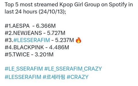 르세라핌 방금 컴백했지만 스포티파이에 에스파 뉴진스 탑2 차지했는데ㅋㅋㅋㅋ
