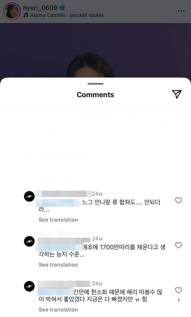 앞서 이날 오전 혜리 계정에 악플을 단 네티즌 정체가 한소희라는 설이 퍼졌다. 이 네티즌은 'catsaretheavengers'라는 계정으로, 혜리 계정에 "류(준열) 합쳐도 안 되더라", "애초에 (팔로우) 1700만을 채운다고 생각하는 능지 수준", "간만에 한소희 때문에 혜리 좋아요수 많이 늘어 좋앗겠다. 지금은 다 빠졌지만. 힝" 등 이라는 댓글을 남겼다.
