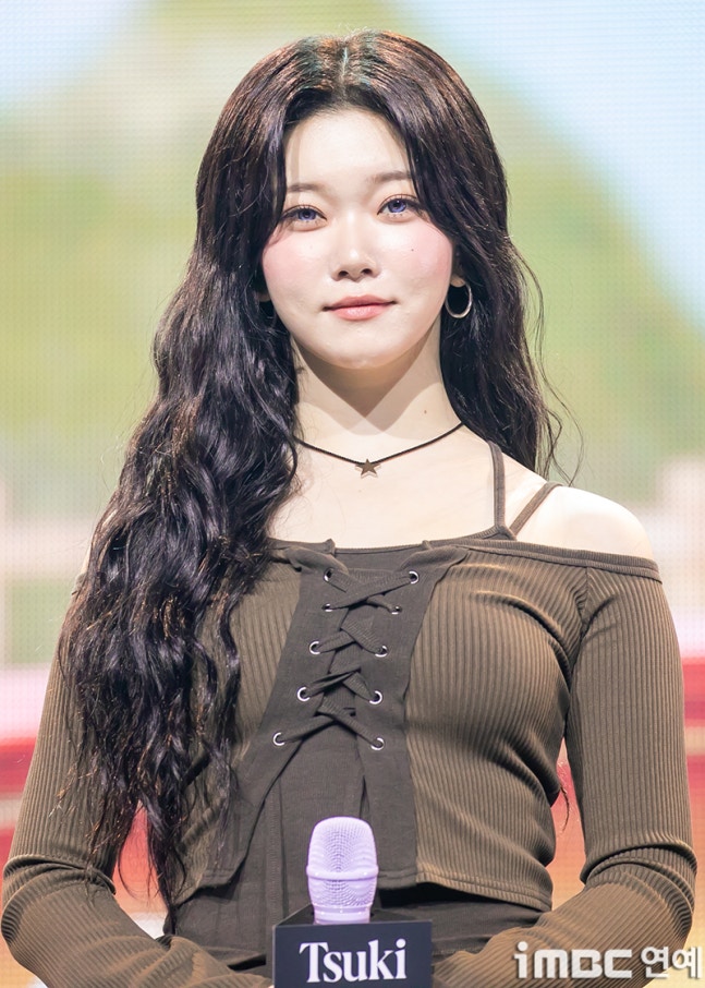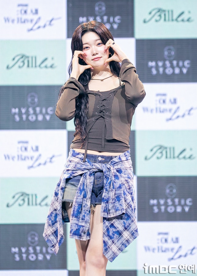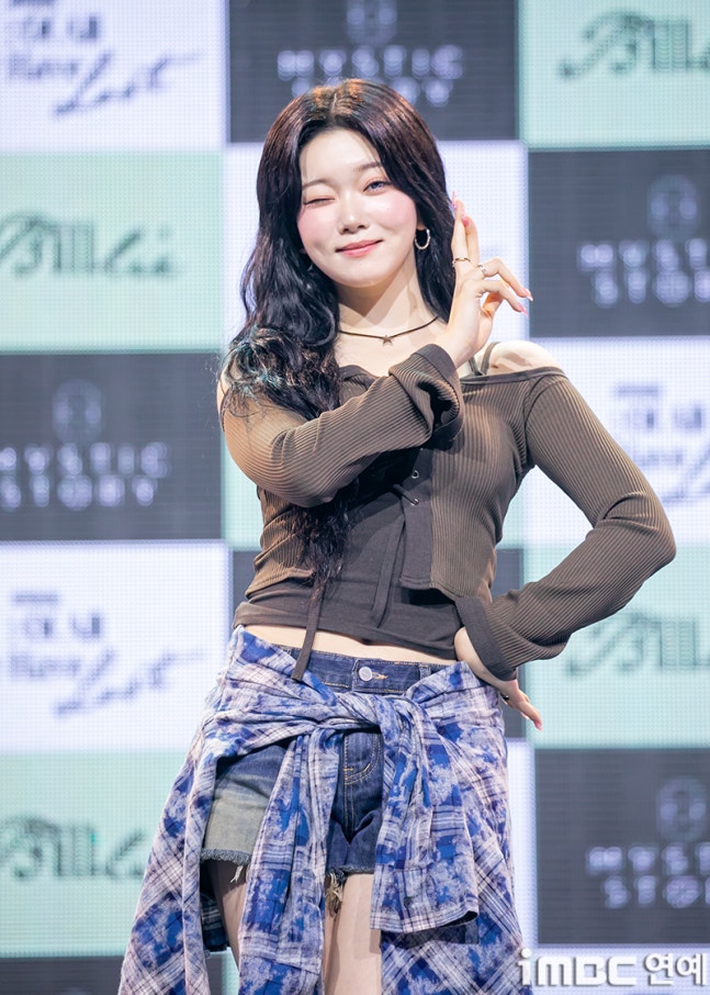 이날 빌리 츠키는 롱 웨에브 헤어에 쇄골이 돋보인 다크 브라운 상의. 미니 청 팬츠에 체크 셔츠를 매치하며 캐주얼 패션을 뽐냈다. 츠키는 사랑스러운 '기억 사탕' 포즈를 취하며 남다른 귀여운 매력을 드러냈다.