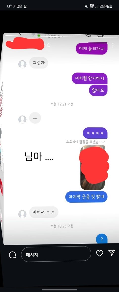 맨날 여자/남자 애들이랑 디엠한 거 스토리에 올리는데 상대쪽 답장이 맨날 단답이라 너무 웃김..