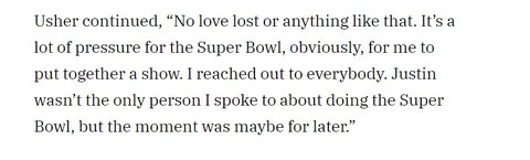 어셔는 인터뷰에서 이렇게 말했음 "슈퍼볼을 해야 한다는 부담감이 커서 모두를 초대했습니다. 저스틴만이 초대한 사람이 아니었습니다."