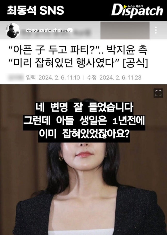 "생일 당일(4일)을 함께 보내진 못했습니다. 저는 일정이 있어 서울로 갔고, 친한 동생에게 아이들을 부탁했습니다. 이를 질타하시면 달게 받겠습니다. 그러나 최동석 씨의 공개 저격은... 더이상 말하지 않겠습니다." (박지윤)