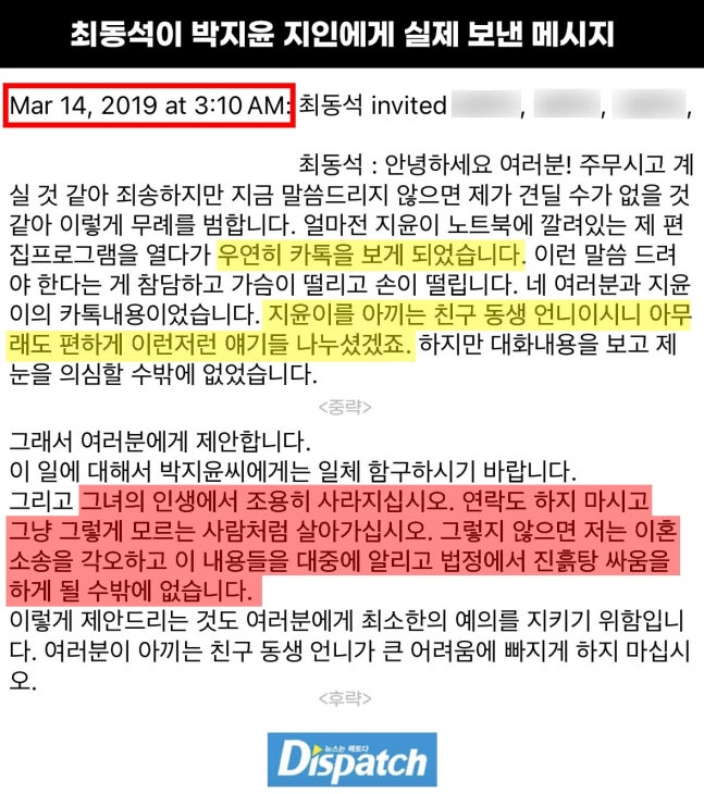 박지윤 : 내가 뭐 떠벌리고 다녔어? 나는 내 친구들이 있는 단톡방에 얘기했어.
