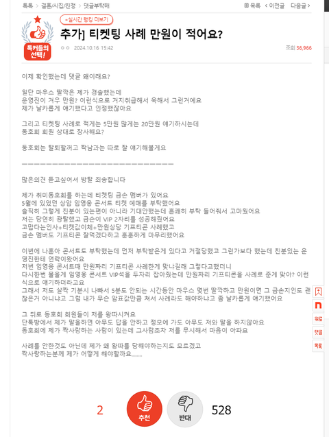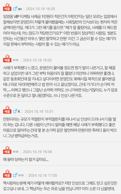 후기가 더 어이없었음. 자기도 욱해서 말 날카롭게 나간 건 인정했잖아요, 라니... 보통 사람은 애초에 그런 말을 들으면 화가 나기보다 가슴이 철렁해서 헉 내가 잘못했나? 싶어서 눈치보기 마련인데... 본인은 욱해서 감정적으로 말한 게 뭐가 문제냐는 마인드. 하긴 애초에 그럴 상식인이면 만원만 보내진 않겠지. 거기서 화를 낸다 이렇게 사고전환 된다는 거 자체가 문제인데 본인만 끝까지 뭐가 잘못인지 모르는듯.
