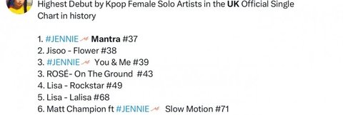 제니 만트라 영국차트 여솔 1위