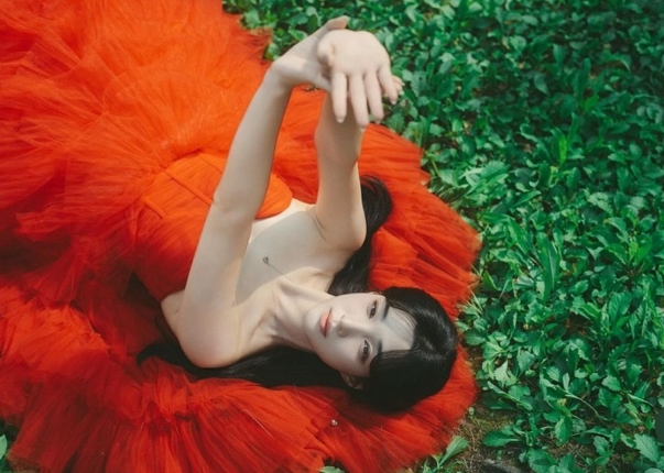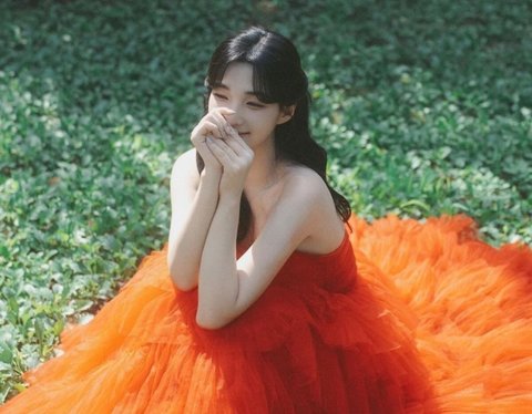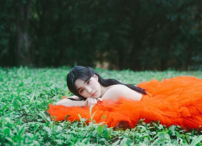 사진 속 율희는 다홍색 오프숄더 벌룬 드레스를 입고 초원에 누워 있는 모습. 율희는 자연스러운 반묶음 스타일로 청초한 미모를 뽐낸 데 이어 가녀린 어깨라인으로 보는 이들의 감탄을 불러일으킨다.