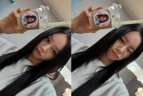 또 다른 사진에서도 혜리는 커피차 앞에서 꽃받침 포즈를 취하며 팬들에게 인증샷을 선물하고 있는 모습이다.