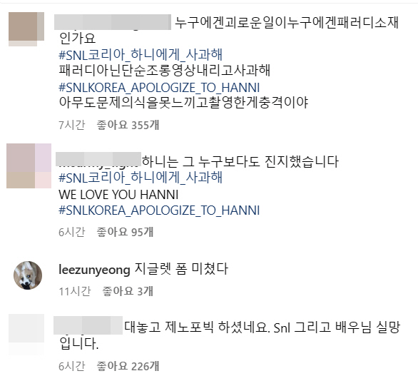 특히 뉴진스 팬들은 지예은의 SNS에 '하니는 그 누구보다 진지했다' '하니에게 사과해'라는 등의 댓글 테러를 가했다. 결국 지예은은 댓글을 차단했다.