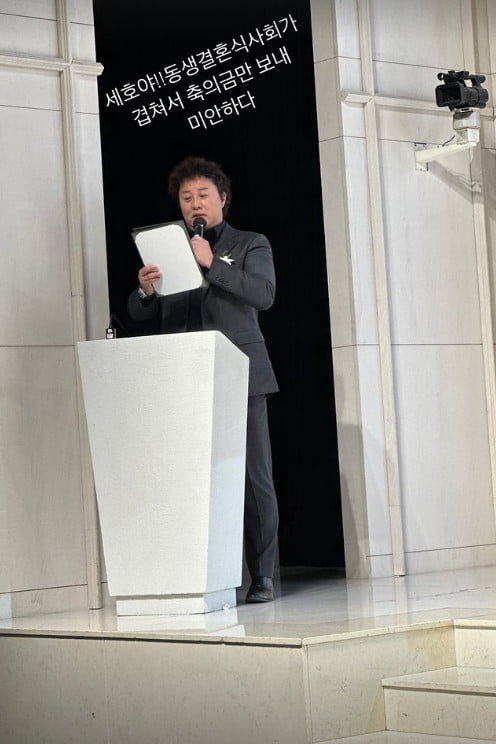 공개된 사진 속에서 정준하는 정장 차림으로 단상에 올라 결혼식 사회를 보고 있는 모습. 특히 이날이 '무한도전' 등으로 인연이 있는 개그맨 조세호가 백년가약을 맺는 날이기도 해 정준하는 부득이한 사정으로 축의금만 보냈음을 알렸다.