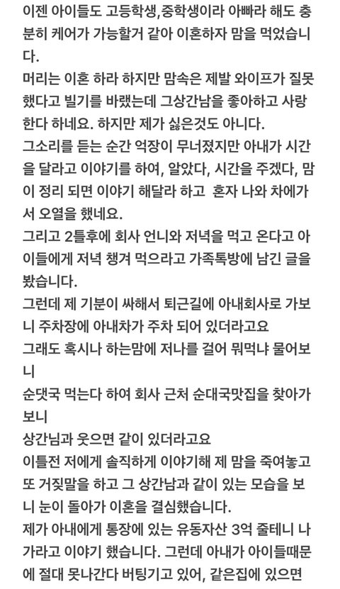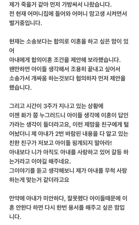 아이들 핑계로 집도 안나가면서 모텔 들어갈때는 아이들 생각 안나냐고 그리고 니가 잘못했다하면 내가 다시한번 용서 해준다 했는데 오늘 또 상간남 만나 모텔 쳐가냐고 했더니 자기는 잘못한거 없다고 너때문에 바람난거라고 자기는 용서 빌 마음도 없고 그냥 이혼하자고 하더라고요