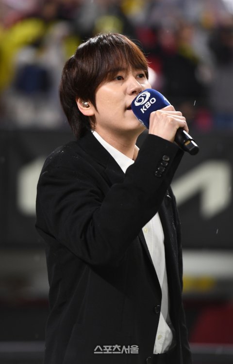 슈퍼주니어 규현이 21일 광주기아챔피언스필드에서 열린 KIA와 삼성과 2024 KBO 한국시리즈 1차전 경기 애국가를 부르고 있다.