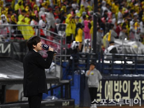 [광주=스포츠투데이 팽현준 기자] 21일 광주 기아챔피언스필드에서 열린 2024 KBO 포스트시즌 한국시리즈 1차전 삼성 라이온즈와 KIA 타이거즈의 경기, 가수 규현이 애국가를 부르고 있다. 2024.10.21.