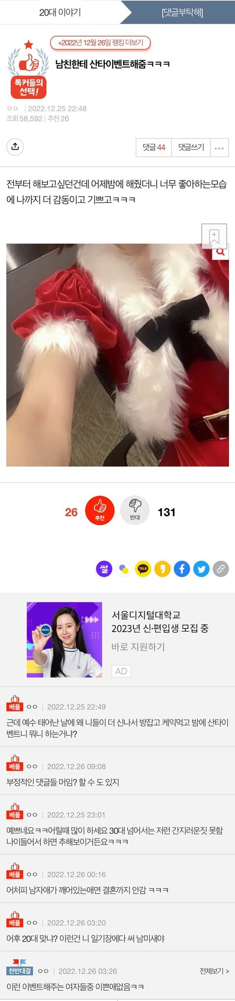 남자가 저런옷입고 성적인 이벤트해준다는 얘기는 후기로도 100개중에 한두개 볼까말깐데, 여자는 나머지가 다 그런 후기임.....이글 포인트는 남자가 해주는 이벤트는 당연하게 본다는게 아니잖음....댓글들 거북목유방단들이 더 많을거같은데 여자들보고 돼지니 뚱뚱이니 뭐니 하네....뉴스좀 봐...남성 비만율이 49.2퍼고 여성 비만율이 27.8퍼임....