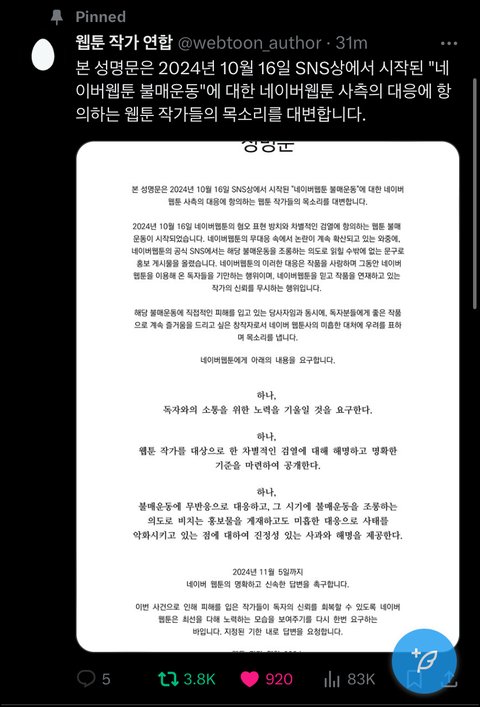 도태남들 불안하긴 한가보다 네웹 얘기 나오면 몰려와서 막으려고 안달이네 기사 댓글에도 좌표찍고 활동하던데. 불매 효과없다 기사내는것도 전형적인 불매 막는 수법이라던데ㅋㅋ 아무튼 작가님들 최대한 빨리 네웹 탈출해서 피해 없으셨으면 네웹때문에 작가님들이 무슨 고생이야