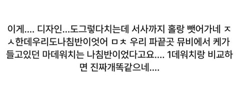 비슷하고 자시고 할게 아니라 손목에 차는건 데이식스가 유일한 팀 아니었음? 너무 뜬금없긴하네 비투비 나팔봉이 있는데 굳이 저런걸 만드네 아님 차라리 응원봉으로 다르게 만들던가 이건 비투비팬들도 어리둥절하겠는데 이거 만약에 쉴드치는 팬 있다면 비투비꺼 딴팀이 똑같이 만들어도 아무말 못해 손목밴드나 안에 나침반이나 너무 데이식스 생각나긴하네