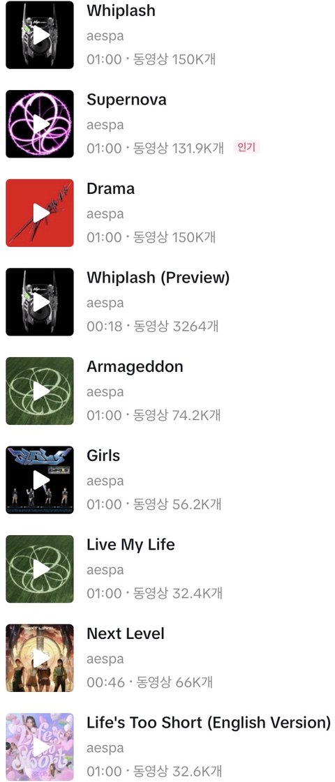 에스파 데뷔곡 모든 컴백곡 통틀어서 요번 위플래쉬 틱톡 영상 음원 사용 최단기 2일 만에 15만개의 틱톡 영상에 사용됨 2일만에 틱톡 영상 음원이 15만개가 사용 됐다는 건 해외에서 초대박 친거란 얘기임 그 쇠맛으로 히트친 멜론 1위 15주 장기적으로 있던 슈퍼노바도 163일만에 틱톡음원 사용 131.9K 이제서야 찍음 그리고 제니 만트라도 12일만에 음원사용 109K 찍음 위플래쉬 이대로만 가고 계속계속 사용된다면 4세대 여돌 피프티 뉴진스 다음으로 에스파가 티톡 음원사용 1M 찍을듯 에스파가 여돌 4세대 탑 이라는게 확 체감됨