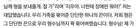 박지우 씨는 "저는 살면서 이런 믿음직한 소리를 들어본 적이 없습니다. 여러분들은 들어보셨나요? 이 얘기를 듣고 저는 비로소 형을 제 마음에서 놔줘도 되겠다고 생각했습니다. 이제 우리 믿음직한 형수님께 형을 보내줄게. 잘 가"라며 '지우야. 너한테 장애란 뭐야?' 저는 대답했습니다. 우리 가족을 묶어준 단단한 하나의 끈이다. 저희 형은 그 단단한 끈으로 우리 형수님까지 꽉 묶어버렸습니다. 형수님! 제 가족이 되어주셔서 정말 감사합니다. 그리고 형! 진심으로 결혼 축하하고 고마워. 그리고 사랑해"라고 이야기했다.