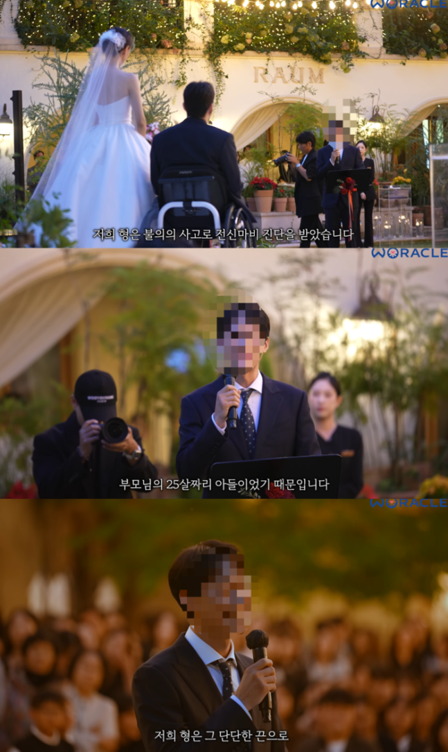 끝으로 동생은 “‘너한테 장애란 뭐야?’라는 말에 저는 대답했다. 우리 가족을 묶어준 단단한 하나의 끈이다. 저희 형은 그 단단한 끈으로 우리 형수님까지 꽉 묶어버렸다. 형수님, 저희 가족이 되어주셔서 정말 감사하다”며 두 사람의 결혼을 축하했다.