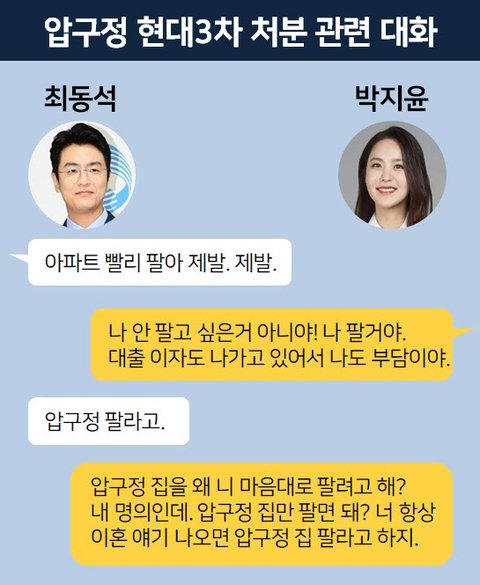 [땅집고]서울 강남구 압구정동 현대3차를 처분하는 문제를 두고 갈등을 빚는 박지윤과 최동석 간 대화 내용. /이지은 기자