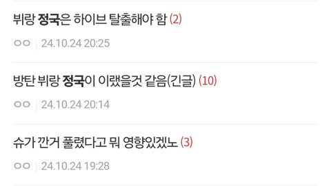 하이브 지금 꼬라지 보고 든 생각 쓴 궁예글임 왜 뷔가 레이오버 일주년 기념하는 글을 인스타에 올렸는지 왜 다른 멤버들이 그 게시물에 좋아요를 눌렀는지 왜 정국이가 가수는 죄가 없다고 한건지 그들을 이용하지 말라고 한건지 모든 퍼즐이 다 맞춰짐 방탄은 특히 영향력도 크니까 간접적으로 표현하고 있었던건 아닐까...다시 말하지만 다 내 궁예기 때문에 반박시 니 말이 다 맞음