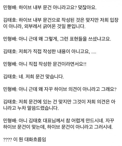 많은 사람들이 오해 하는 것이 그 문건의 내용 자체가 하이브가 작성한 것으로오해 하고 있다는 것. 왜냐면, 국회 의원이 그런식으로 오도 하게끔 선동적인 의사 진행을 한 거