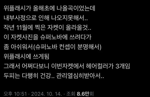 드디어 건수잡았다고 윈터 이번에 한 단발로 그런 얘기 하던데 그 컨포 슈퍼노바때 쓰려고 !!!작년에!!! 찍었다가 컨셉 안 맞아서 뺐던거래. 윈터가 컴백 전에 컨포 떴을 때? 라방에서 말했나봄.