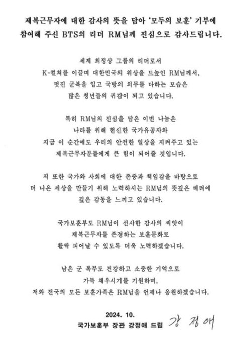남준이가 국가 보훈에 1억 기부해서 국가보훈부 장관이 감사편지 쓴거임ㅜㅜ 너무 멋져