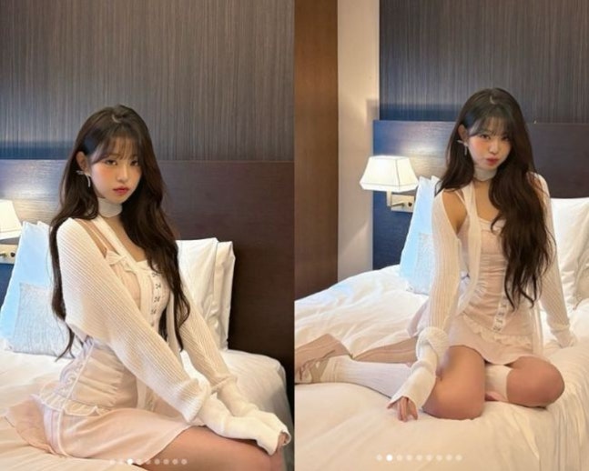 사진 속 장원영은 민소매 미니 원피스를 입고 니삭스에 샌들을 착용한 채 다양한 포즈를 취하고 있는 모습이 담겼다. 볼레로 카디건을 살짝 흘러내린 채 자세를 취하거나 침대 끝에 걸터앉아 다리를 꼬며 새침한 표정을 짓는 등 여리여리한 자태를 뽐냈다.