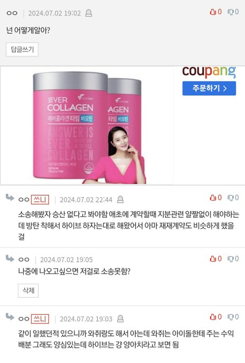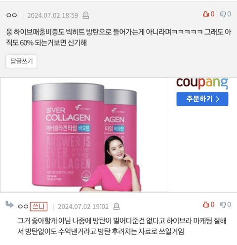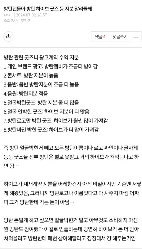 옛날에 누가 판에서 하이브랑 일한적 있는데 굿즈 이런거 많이 팔아도 방탄한테 돈 안간다했음 내가 그래서 방탄은 그런걸로 항ㅇ의안하냐하니까 방탄은 착해서 재재계약도 그렇게했을거라고함