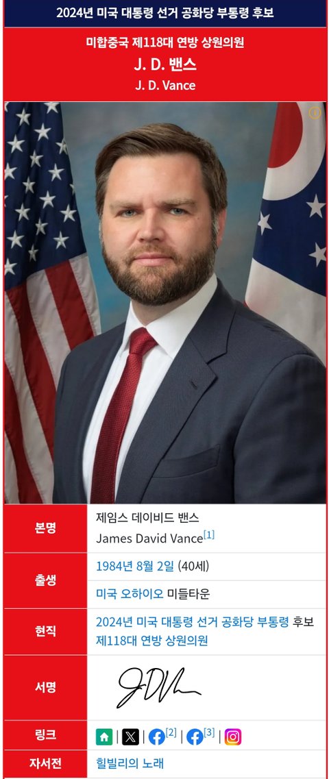 (사진3 설명) 제임스 데이비드 밴스(James David Vance) 미합중국 제118대 연방 상원의원 <출처 : NAVER 나무위키>