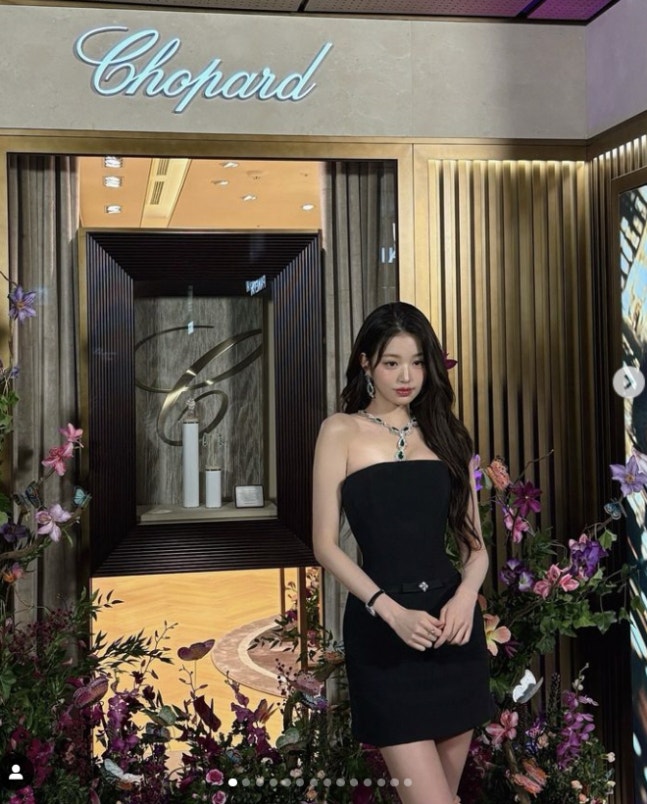 소매가 없는 브라톱 상의의 초미니 블랙 드레스를 선택한 장원영은 화려한 주얼리를 과시하며 행사장에 나섰다.하지만 반짝이는 고가의 주얼리가 보이지 않을 만큼 장원영의 미모가 덮어버렸다.