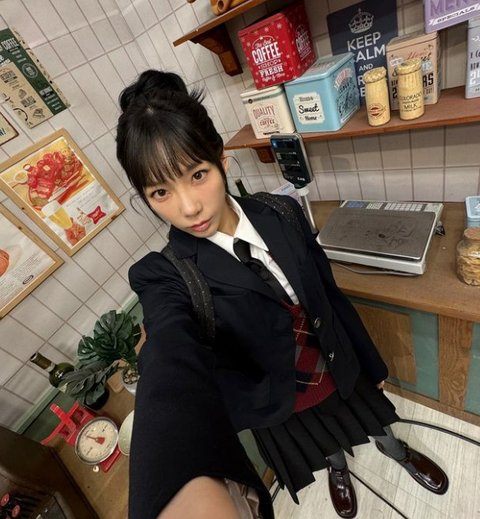 태연 소셜미디어사진 속 태연은 셔츠에 넥타이, 조끼에 교복 재킷을 착용한 모습이다. 단정하게 올려 묶은 머리에 당돌한 듯 귀여운 눈빛까지 더해져 신분증 검사를 부르는 10대 비주얼을 자랑한다.