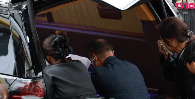 이날 고인의 유족을 비롯해 개그맨 정준하, 윤정수, 장동민 등 많은 동료가 자리했다. 특히 김수미의 며느리 서효림은 운구가 시작되자 "엄마 가지마"라며 오열해 안타까움을 자아냈다. 정준하와 윤정수, 장동민, 문태주PD가 차에 관을 운구했다.
