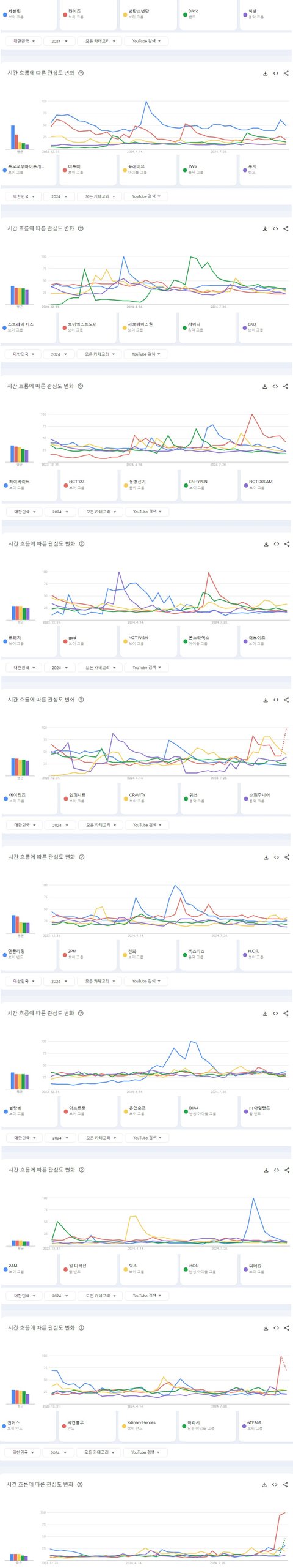 2024년 현재까지 한국 유튜브에서 가장 많이 검색된 남자아이돌그룹 TOP50