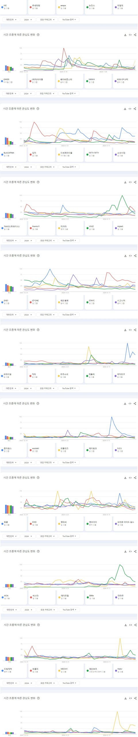 2024년 현재까지 한국 유튜브에서 가장 많이 검색된 여자아이돌그룹 TOP50
