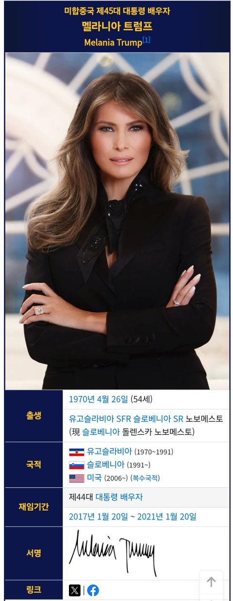 (사진10 설명) 멜라니아 트럼프(Melania Trump) 미합중국 제45대 대통령 배우자 <출처 : NAVER 나무위키>