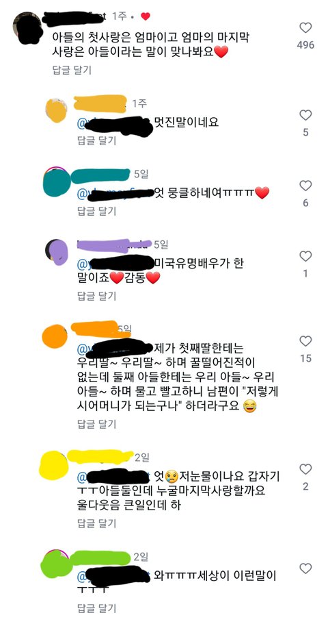 진짜 징그러워 아들한테 저딴 워딩을 쓰는 거 자체가 뇌 구조가 좀 다른 거 같음... 아들 낳으면 왜 다 저렇게 되는 걸까