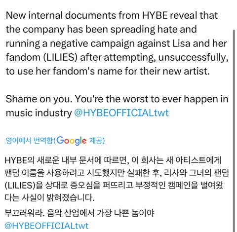 리사 좋지 않은 언론 분위기 만든게 하이브였다니 ㄷ ㄷ 진짜 무섭다