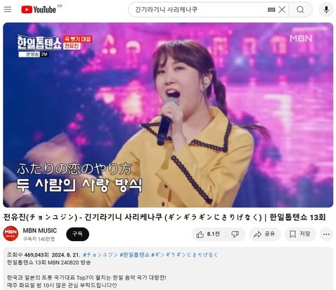 (사진1 설명) 스미다 아이코(住田愛子) - 긴기라기니 사리케나쿠 (ギンギラギンにさりげなく)|한일가왕전 2회 YouTube MBN 동영상 화면 캡춰