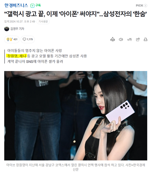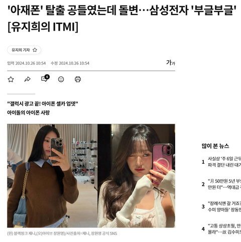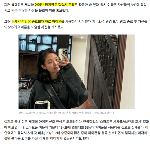 비슷한 내용으로 갤럭시 아이폰 웅앵 제니 장원영 머리채잡는 뉴스가 올라옴